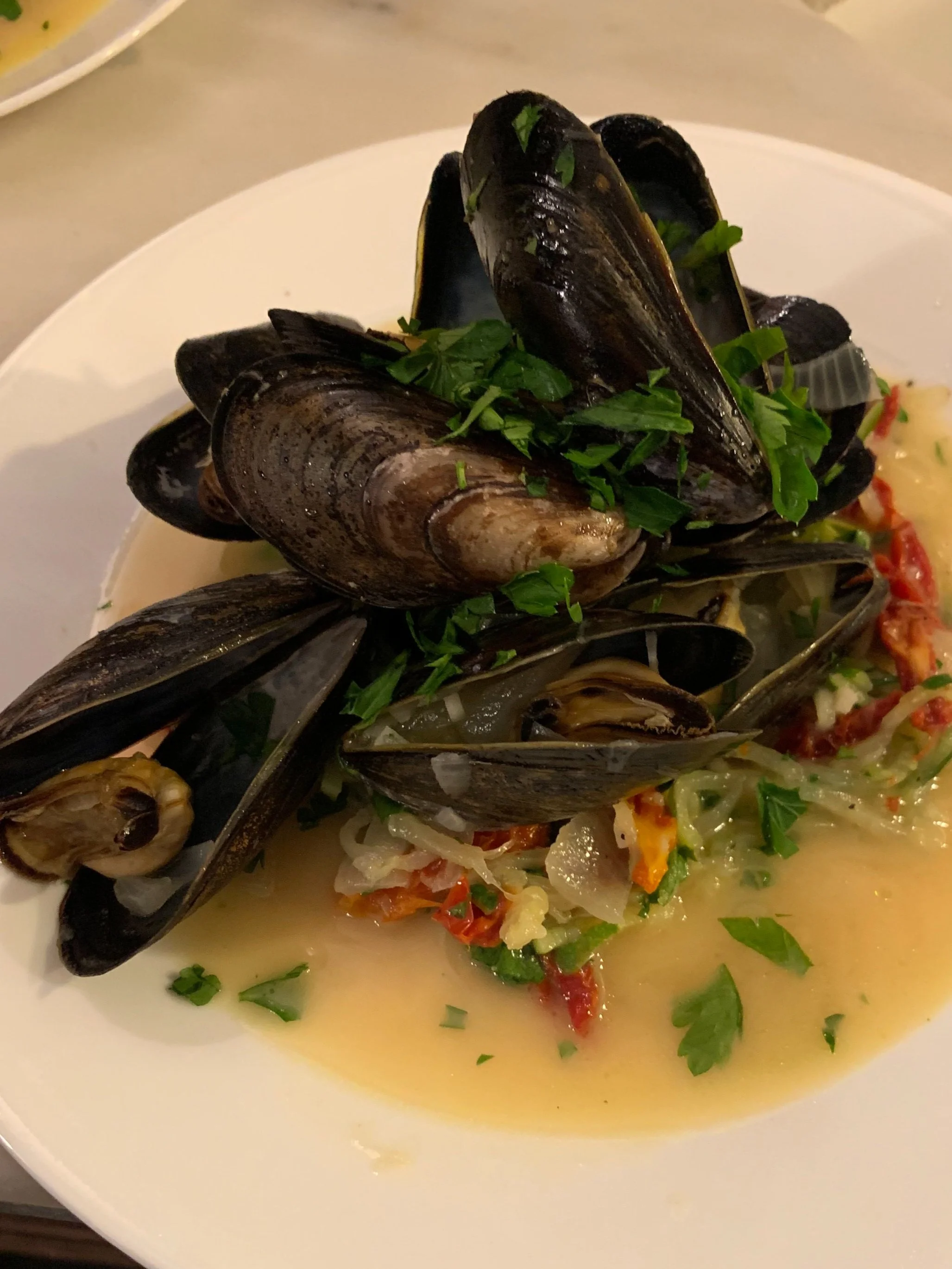 Mussels over Zucchini noodles with sun-dried tomato’s in a delicate broth.
