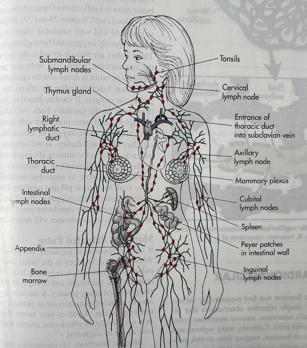 Some experts recommend starting at the nodes to “prep them.” Some say to start at the extremities and move in an upward motions towards the heart and lymph node clusters (such as the armpits, groin, and neck see figure for all the nodes) to helps guide fluid to filtration points where it can be processed and eliminated.